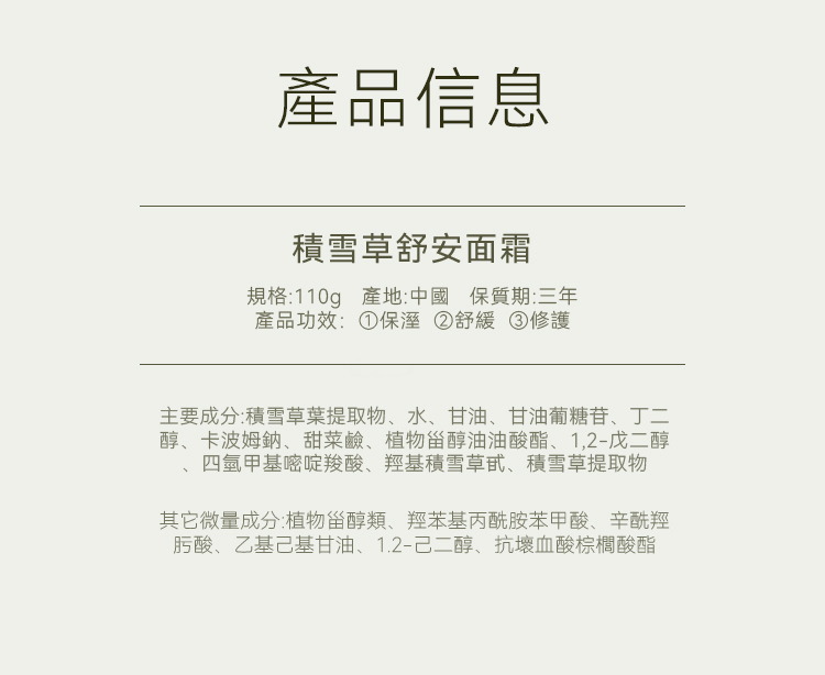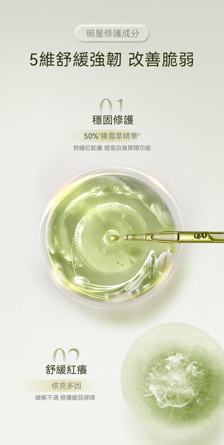 功效:保濕舒緩鎮定,改善脆弱,曬後修護,舒緩皮膚乾癢泛紅,修護肌膚屏障