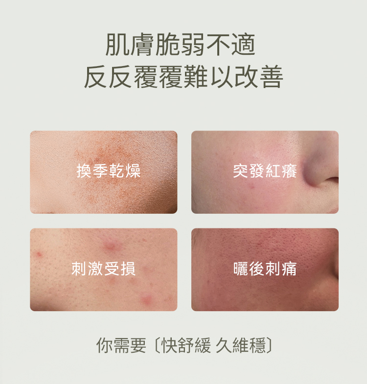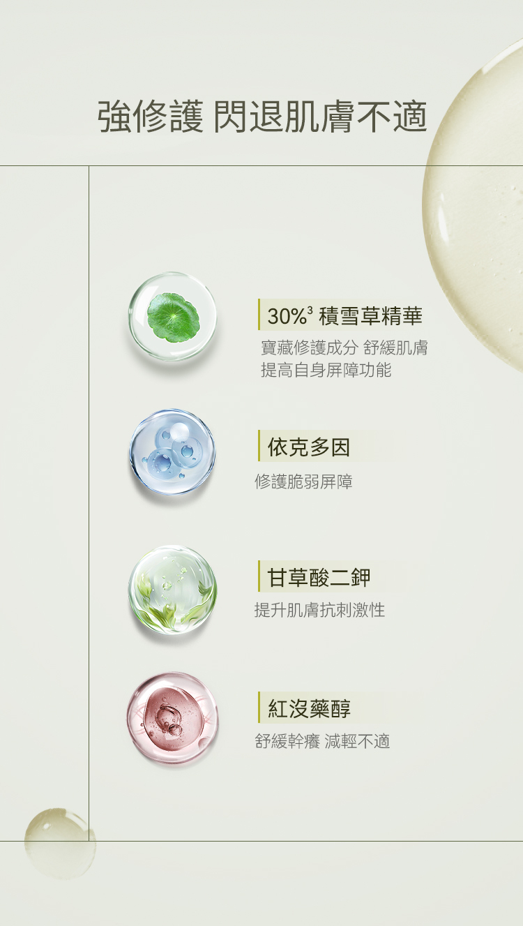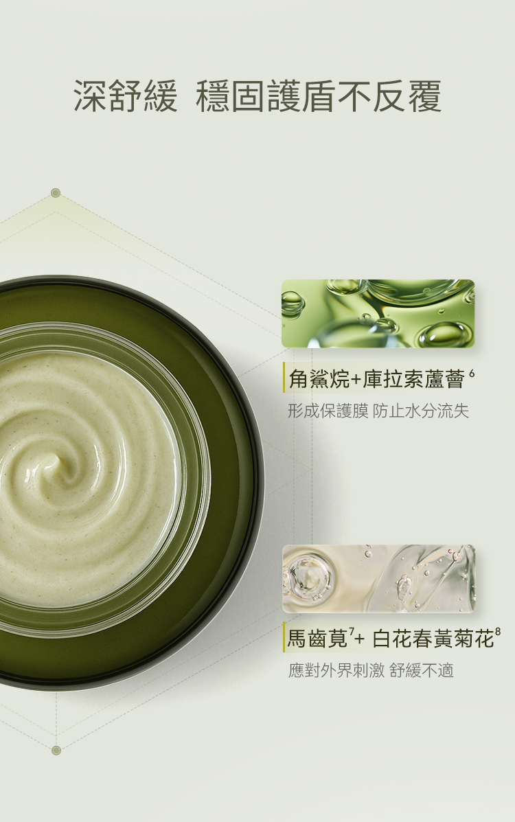 功效:密集舒緩鎮定,修護敏感因子,補水保濕,滋養呵護肌膚,強韌肌膚屏障,舒緩易泛紅及乾癢