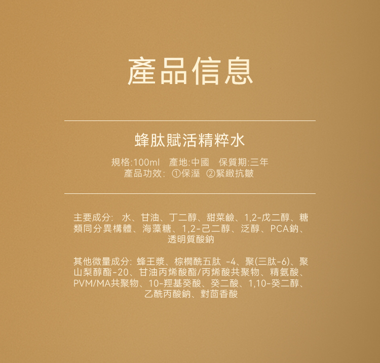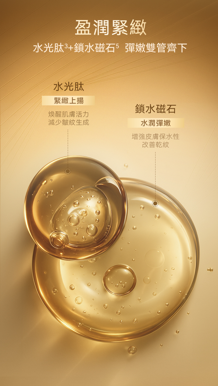 功效:持續保濕鎖水,淡紋緊緻,自身激活肌膚鎖水能力,易吸收,即時感水潤,緊緻輪廓